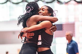 * Two athletes celebrate after performing at New Balance Nationals Indoor in Boston
